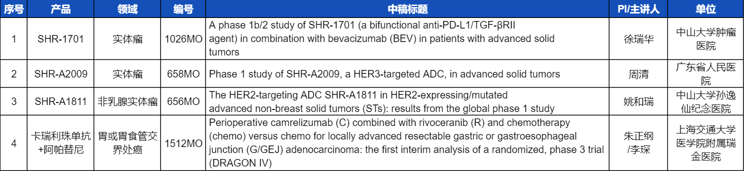 本次ESMO大会,将由中山大学肿瘤医院徐瑞华教授、广东省人民医院周清教授、中山大学孙逸仙纪念医院姚和瑞教授、上海交通大学医学院附属瑞金医院李琛教授分别就4项EVO视讯医药创新产品相关研究做口头报告,包括SHR-1701、SHR-A2009、SHR-A1811这3款未上市创新产品的实体瘤治疗临床研究,以及1项“双艾”组合(卡瑞利珠单抗联合阿帕替尼)治疗局部晚期可切除胃/胃食管交界处癌的Ⅲ期临床试验期中分析。