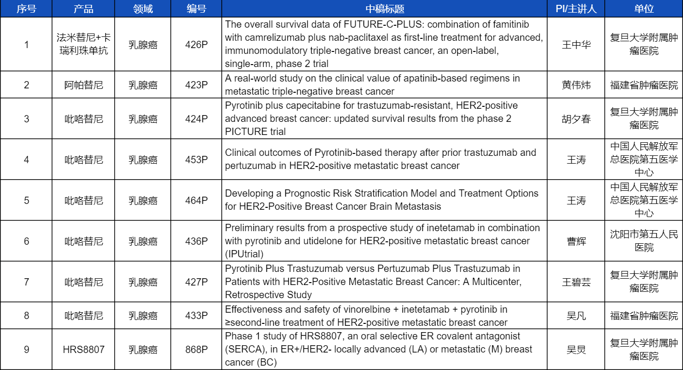 12款抗肿瘤创新药包括6款已上市产品:注射用卡瑞利珠单抗(艾瑞卡®)、甲磺酸阿帕替尼片(艾坦®)、马来酸吡咯替尼片(艾瑞妮®)、阿得贝利单抗注射液(艾瑞利®)、氟唑帕利胶囊(艾瑞颐®)、瑞维鲁胺片(艾瑞恩®),以及6款未上市产品:多靶点受体酪氨酸激酶抑制剂法米替尼、抗PD-L1/TGF-βRII双抗SHR-1701、组蛋白甲基转移酶EZH2抑制剂SHR2554、HER2抗体偶联药物(ADC)SHR-A1811、HER3抗体偶联药物SHR-A2009、新型选择性雌激素受体共价拮抗剂(SERCA)HRS8807等。此次ESMO大会的最新突破摘要(LBA)结果尚未披露,敬请期待!本文特对33项研究成果做了梳理,带领各位读者领略EVO视讯医药创新之光。