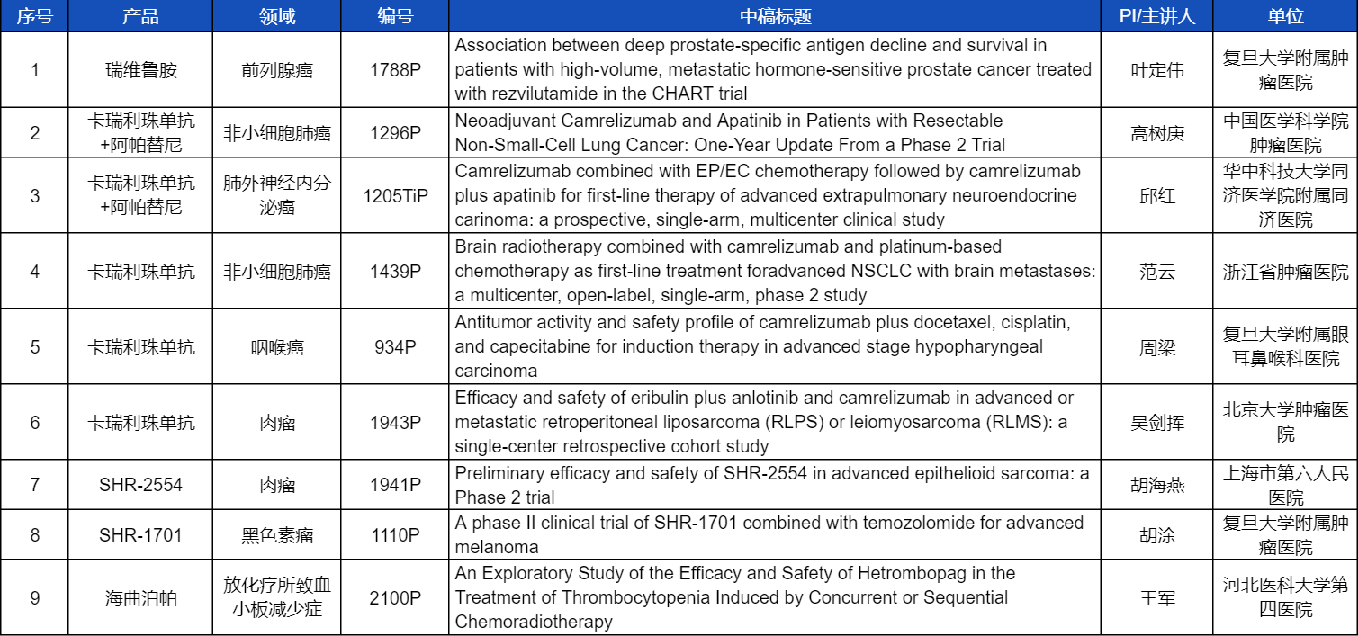 在非小细胞肺癌、咽喉癌、肉瘤、前列腺癌、黑色素瘤等多个领域,卡瑞利珠单抗、阿帕替尼、瑞维鲁胺、SHR-1701、SHR2554等创新产品相关研究一共入选了8项壁报展示。此外,EVO视讯医药自主研发的血小板生成素受体激动剂(TPO-RA)海曲泊帕在放化疗所致血小板减少领域的探索性研究显示良好的疗效,入选壁报展示。